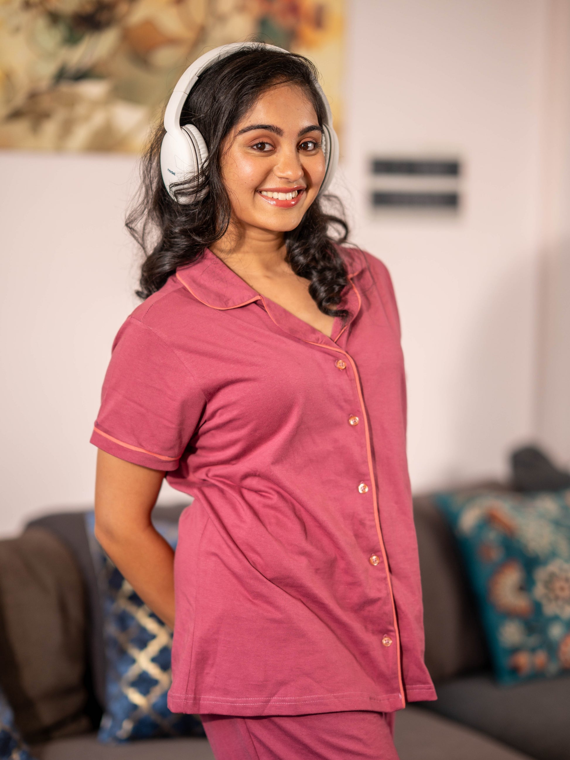 Unwind in ultimate comfort with this soft, breathable cotton pyjama set, designed to offer you a relaxed fit and a peaceful night’s sleep. Featuring a stylish Cuban collar and a classic half-sleeve top, this set is perfect for lounging or restful nights.