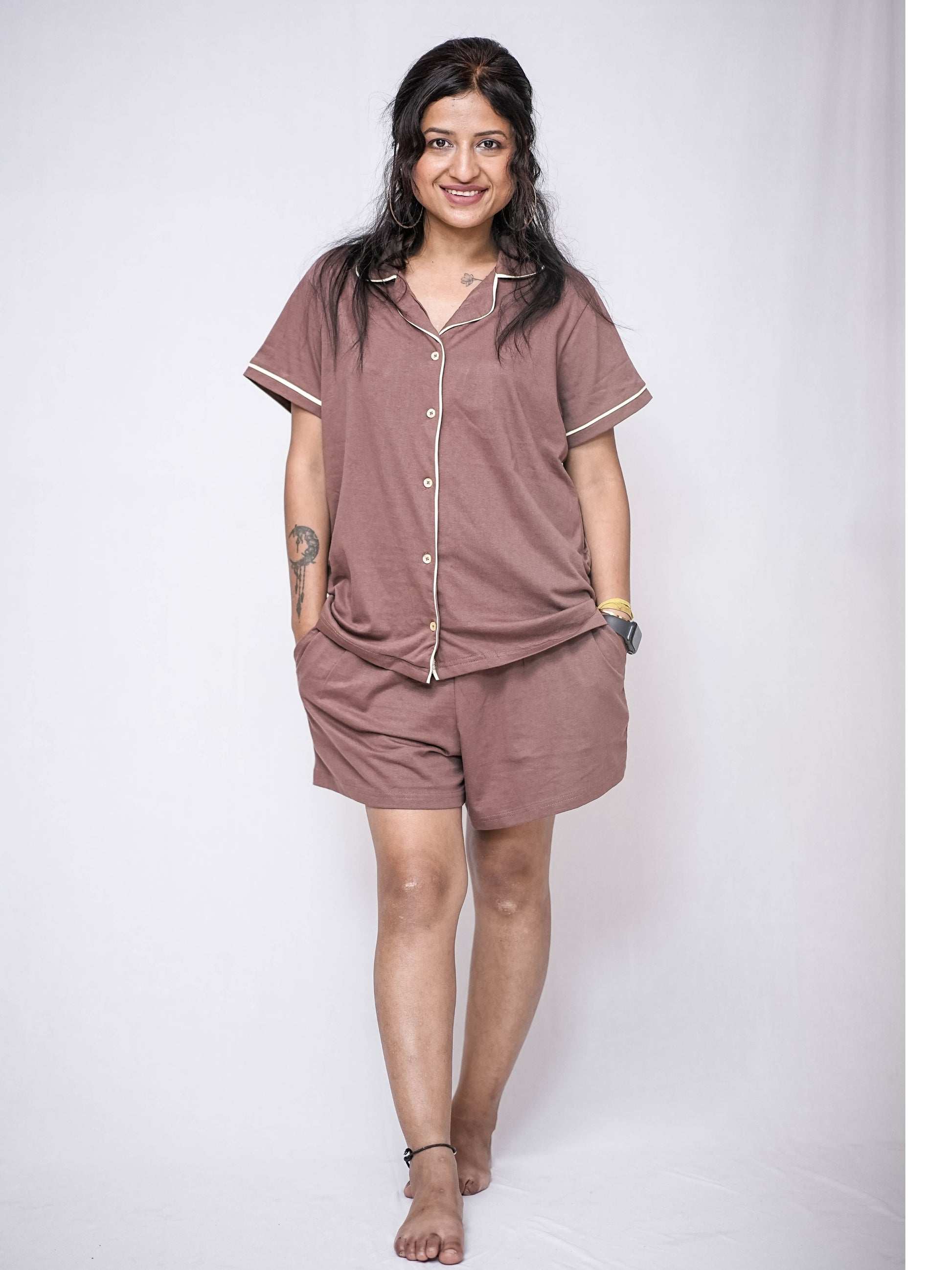 Relax in comfort and style with this soft cotton pyjama set. Designed for the ultimate ease, this set features a half-sleeve top with a sleek Cuban collar and matching shorts for a light, breathable fit perfect for warmer nights.